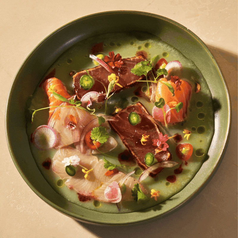 chili- crusted ahí, cured salmon, hamachi, honey avocado puree, lemongrass leche de tigre, red onion, radish, orange blossom honey * S
